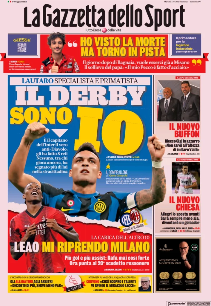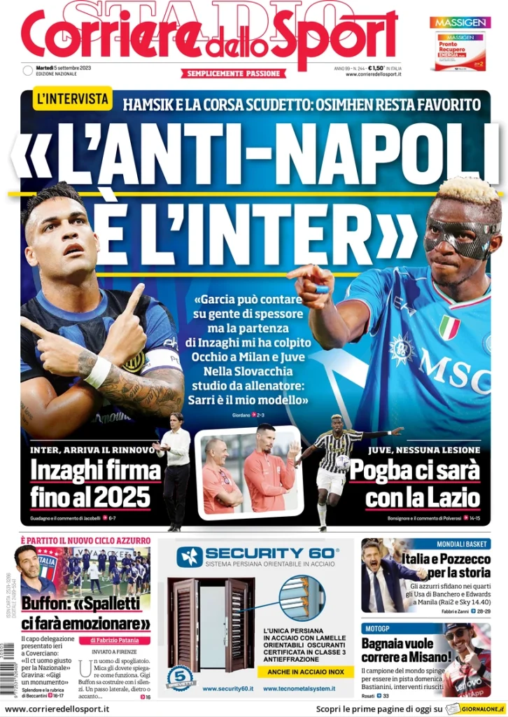 Ecco le prime pagine dei principali quotidiani sportivi nazionali di oggi, 5 settembre, in edicola: Gazzetta, Corriere, Tuttosport