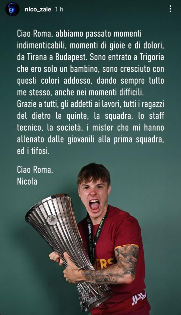 Nicola Zalewski ha affidato ad una storia Instagram le proprie emozioni per l’addio alla Roma dopo tantissimi anni vissuti in giallorosso. L’esterno polacco, trasferitosi a gennaio in prestito al calciomercato Inter, è stato infatti riscattato dai nerazzurri. Il club meneghino ha versato nelle casse del club romano circa 6,5 milioni di euro.